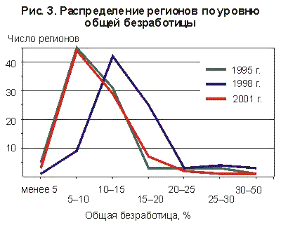 Динамика распределения регионов по уровню безработицы циклична, в 2001 г. распределение почти повторяло картину 1995 г. (рис. 3). Но, как известно, в середине 1990-х годов государственной политики в сфере занятости практически не было. Возвращение "на круги своя" говорит о том, что позитивное воздействие экономического роста не подкреплялось политикой снижения региональных диспропорций. Они остались прежними и даже усилились: максимальный уровень безработицы сохранился в большинстве республик Европейского юга и в национальных образованиях юга Сибири, уровень безработицы в наиболее депрессивных регионах Дальнего Востока по-прежнему в 1,5-2 раза выше среднего по стране. Для выравнивания региональных различий недостаточно перераспределения бюджетных ресурсов, требуется кардинальное улучшение условий для экономического роста в проблемных регионах.