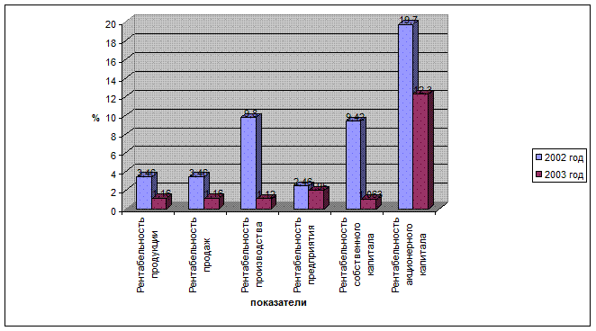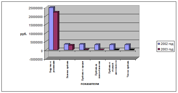 8) в 2003 году наблюдалось падение всех показателей прибыли и финансовых результатов деятельности предприятия. Значение чистой прибыли в 2003 году отрицательно, что означает, что организация работает в убыток.
