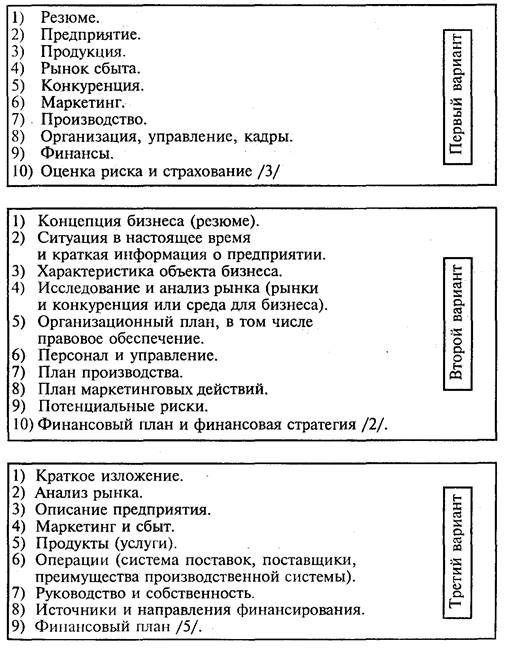 Однако, как правило, в нем предусматриваются разделы, в которых раскрываются основная идея и цели бизнеса, характеризуется специфика продукта предприятия и удовлетворения им потребностей рынка, дается оценка рынка и устанавливается стратегия поведения фирмы на определенных рыночных сегментах, определяется организационная и производственная структура, формируется финансовый проект дела, включая стратегию финансирования и предложения по инвестициям, описываются перспективы роста пред приятия.