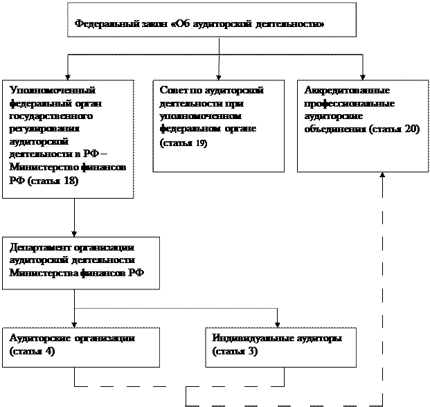 В настоящее время система нормативного регулирования аудита в России находится в стадии становления. Это связано с формированием новой организационно-правовой структуры аудиторской деятельности в РФ в соответствии с требованиями Закона «Об аудиторской деятельности» №119-ФЗ от 07.08.2001(рисунок 1).