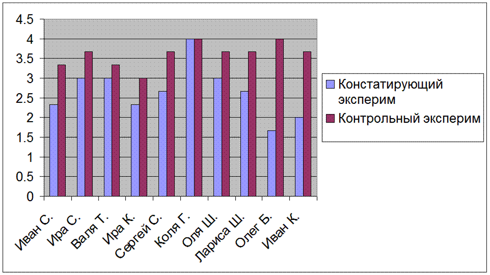 Констатирующий эксперимент был проведен в начале учебного года (сентябрь), в течение учебного года проводилась коррекционная работа с логопедом и в конце учебного года (май) бы проведен контрольный эксперимент.