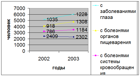 Из рисунка 4 заметны тенденции роста численности прошедших лечение допризывников в 2003 году по заболеваниям костно-мышечной системы с 1129 до 1135 человек, системы кровообращения с 560 до 770 человек, органов пищеварения с 702 до 943 человек, глаза с 737 до 542 человек.