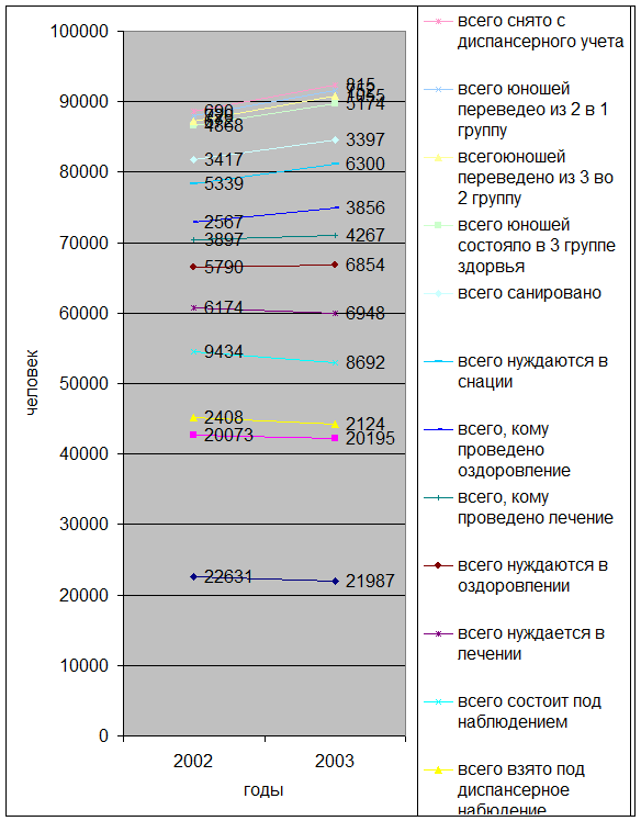 - в 2003 году произошло снижение общего количества допризывников, состоящих на учете в диспансере с 9434 до 8692 человек;
