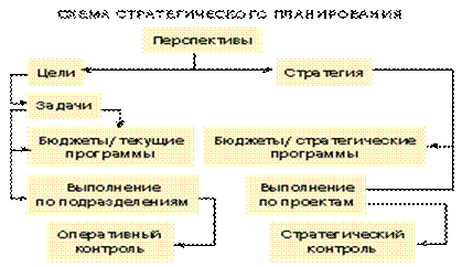 Стратегическое планирование представляет собой набор действий и решений, принятых руководством, которые ведут к разработке специфических стратегий, предназначенных для того, чтобы помочь организации достичь своих целей. Стратегическое планирование заключается в основном в определении главных целей деятельности фирмы и ориентировано на определение намеченных конечных результатов с учетом средств и способов достижения поставленных целей и обеспечения необходимыми ресурсами. При этом разрабатываются также новые возможности фирмы, например, расширение производственных мощностей путем строительства новых предприятий или приобретения оборудования, изменения профиля предприятия или радикальное изменение технологии. Стратегическое планирование охватывает период в 10-15 лет, имеет отдаленные последствия, влияет на функционирование всей системы управления и основывается на огромных ресурсах. Для сравнения текущее планирование заключается в определении промежуточных целей на пути достижения стратегических целей и задач. При этом детально разрабатываются средства и способы решения задач, использование ресурсов, внедрение новой технологии. Стратегическое планирование ставит целью дать комплексное научное обоснование проблем, с которыми может столкнуться фирма в предстоящем периоде, и на этой основе разработать показатели развития фирмы на плановый период. В основу при разработке стратегического плана кладется: