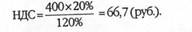 НДС = (400 х 20%) : 120% = 66,7 (тыс. руб.);