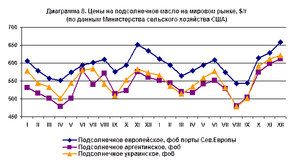 На объемы российского экспорта подсолнечного масла также влияла ситуация, сложившаяся на мировом рынке. Цены на подсолнечное масло здесь существенно колебались, что было связано с наличием сырья в конкретный период, а также с объемами производства и предложения (диагр.8). К концу года, когда большая часть ресурсов была выбрана, цены на подсолнечное масло резко выросли, по сравнению с августом декабрьские цены повысились на 20-30 процентов.