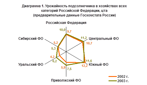 В 2003 г. собран самый высокий урожай подсолнечника за последние 5 лет. Рост валового сбора был обусловлен в основном существенным расширением посевных площадей по сравнению с 2002 г., тогда как урожайность повысилась незначительно. Производство подсолнечника выросло во всех федеральных округах, возделывающих его.