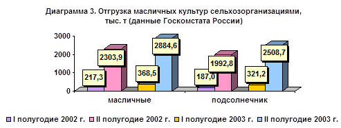 В течение всего 2003 г. маслоперерабатывающие заводы были обеспечены сырьем в более полном объеме и более длительный период, чем в предшествующем году. Производство растительного масла выросло и, по предварительным данным Госкомстата России, составило 1515 тыс. т, что на 26,6% больше, чем в 2002 г., в том числе выросли и объемы производства подсолнечного масла – на 1435,5 тыс.т или на 28,5 процентов.