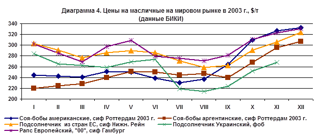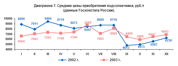 Изменение средних цен приобретения подсолнечника в прошедшем году колебалось, особенно в III квартале (диагр.7). Высокие объемы предложения в первой половине 2003 г. сдерживали рост цен приобретения, по мере сокращения их запасов цены резко выросли. Снижение цен в июле в значительной степени было связано с большими объемами импорта сои в этот период.