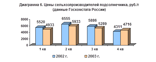 Среднегодовая цена сельхозпроизводителей в прошлом году была на 1,4% выше, чем в 2002 г. и составила 4861 руб./т. Основной объем подсолнечника был реализован в IV квартале, по более высокой, чем в 2002г. цене (диагр.6).