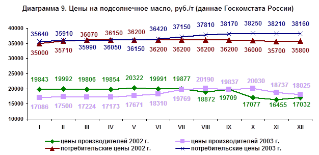 Цены производителей на подсолнечное масло на внутреннем рынке в 2003 г. колебались (диагр.9) в результате, в декабре 2003 г. уровень цен производителей по сравнению с декабрем предыдущего года был выше на 7,5 процента.