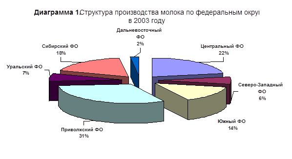 Таблица 1. Производство молока в Российской Федерации в разрезе федеральных округов в 2002-2003 гг. по данным Госкомстата России, тыс.т