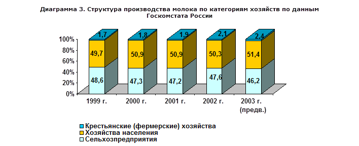 В 2003 году валовое производство молока в хозяйствах всех категорий составило 33,3 млн т, что несколько меньше, чем в предыдущем году. Снижение произошло в результате ощутимого сокращения производства в сельхозорганизациях. Продуктивность коров в этой категории хозяйств продолжала увеличиваться, однако её прирост уже не компенсировал недобор продукции из-за сокращения поголовья коров, темпы которого в отчетном году были существенно выше предыдущего года. Тяжелое финансовое положение большинства хозяйств, состояние кормовой базы определили сокращение численности коров в сельхозорганизациях.