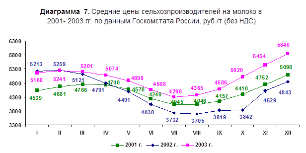 Динамика цен на молоко в прошедшем году имела существенное отличие от предыдущего года. Сезонное понижение цен на реализуемое сельхозорганизациями молоко в отчетном периоде было не таким резким и менее продолжительным (диагр.7,8). В период «большого молока» цены реализации снижались до августа, после чего - ежемесячно росли высокими темпами (от 4 до 7 процентов). Средняя цена реализации на молоко в декабре прошлого года (по данным Госкомстата России) составила 5840 руб./т (без учета НДС), что почти на 19% выше декабря предыдущего года. В среднем за 2003 год рост цены реализации по сравнению с предыдущим годом составил 11,2 процента.