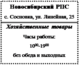 3) Режим работы магазина «Хозяйственные товары» Кубовинского сельпо Новосибирского РПС с 10 до 19 часов.