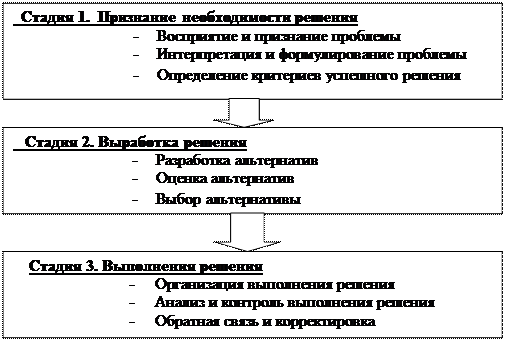 Принятие решений в управлении представляет собой сложный и систематизированный процесс, состоящий из ряда этапов и стадий, начинающийся с формулирования проблемы и заканчивающийся совершением действий, решающих эту проблему (рис. 1).