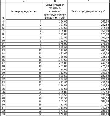 При проведении статистического наблюдения за деятельностью предприятий корпорации получены выборочные данные по 32-м предприятиям, выпускающим однородную продукцию (выборка 10%-ная, механическая), о среднегодовой стоимости основных производственных фондов и о выпуске продукции за год.