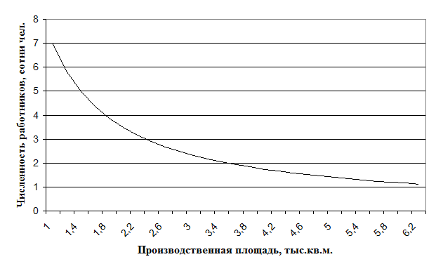 Итак, 140 работников райпо, используя 4,97 тыс. кв. метров производственной площади, обеспечат товарооборот 26,401 млн. руб., и такой же товарооборот могут обеспечить 297 работников, используя площадь 2,347 тыс. кв. метров (рис.1).