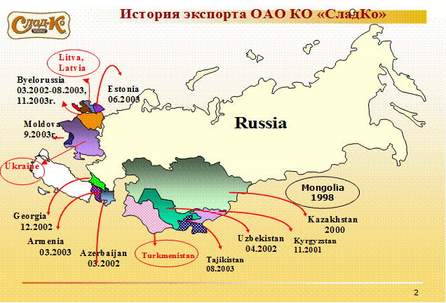 В 2004 г. ОАО «Сладко» планирует выйти на новые рынки, самым главным рынком должен стать Казахстан (с примерным объемом 400 тонн), Азербайджан – увеличение объемов до 300 тонн, Таджикистан увеличение объемов до 200 тонн, Беларусь – до 100 тонн.