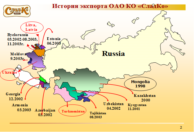 Таким образом, в 2004 г. ОАО «Сладко» планирует выйти на новые рынки, самым главным рынком должен стать Казахстан (с примерным объемом 400 тонн), Азербайджан – увеличение объемов до 300 тонн, Таджикистан увеличение объемов до 200 тонн, Беларусь – до 100 тонн.