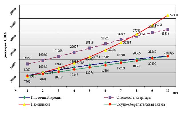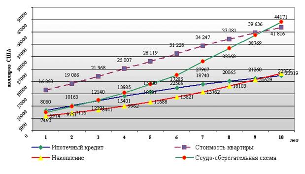 Допустим, что у желающего улучшить свои жилищные условия есть собственные накопления в размере $5000, доход $500 в месяц и желание приобрести квартиру стоимостью $15 000. При этом он готов в течение 10 лет тратить на эти цели 30% от своего дохода.