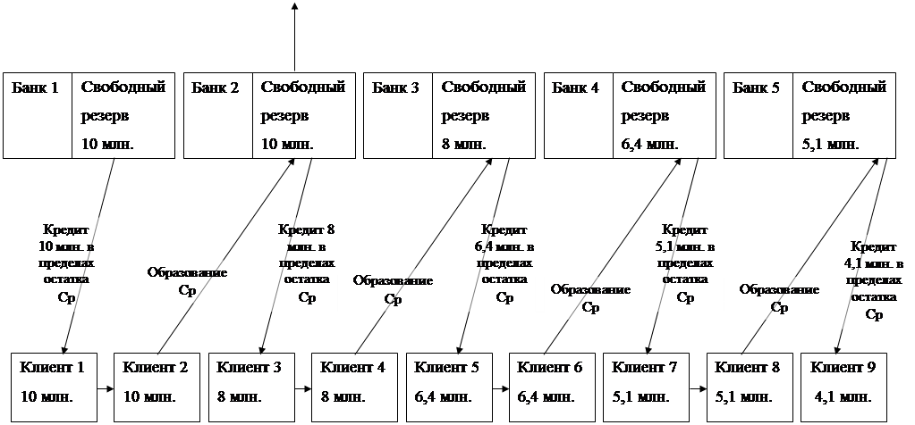 Свободный резерв коммерческого банка 4 исчезает (хотя средства на расчетном счете клиента 6 остаются неизрасходованными), у коммерческого банка 5 он появляется. В свою очередь этот банк часть своего свободного резерва - 1 млн. руб. (20 % ПР) оставляет в центральном банке в виде отчислений в централизованный резерв, а остальную часть (4,1 млн. руб.) использует для выдачи ссуды клиенту 9. Далее процесс продолжается до полного исчерпания свободного резерва, который в итоге за счет отчислений в централизованный резерв аккумулируется в центральном банке и достигает размера первоначального свободного резерва (10 млн. руб. в банке 1).