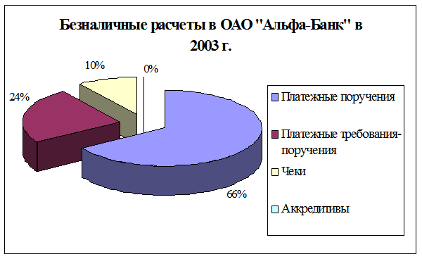 При проведении анализа осуществления безналичных расчетов в данном банке выяснилось, что за последние 3 года (2001-2003 гг.) в целом наглядно заметна тенденция роста (за исключением чеков) всех форм безналичных расчетов. Доминирующее положение в безналичных расчетах в ОАО "Альфа-Банк" занимают платежные поручения (на 2003г. составили 66% от общего объема безналичных расчетов и их рост составил за три года 2%). (Плакат №5)