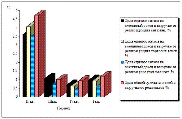 Доля единого налога на вмененный доход и доля общей сумме платежей в выручке от реализации во II квартале 2002 года составляла намного больше, чем в период с III квартала 2002 года по I квартал 2003 года. Данная ситуация сложилась в связи с тем, что во II квартале 2002 года фирма «РИПЭЛ только начинала свою деятельность на данном сегменте рынка, выручка была относительно небольшой и товар являлся новым для астраханского потребителя.