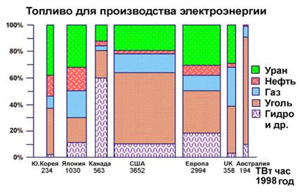 Рис.1. Топливо для производства электроэнергии. Ширина прямоугольника пропорциональна полному количеству произведенной электроэнергии в 1998 году (ТВт час)[1]