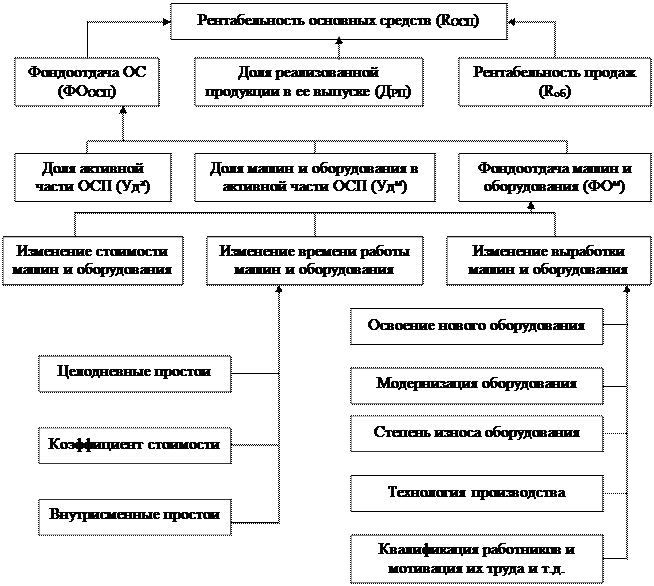 Наиболее обобщающим показателем эффективности использования основных средств является рентабельность капитала, вложенного в основные средства. Ее уровень зависит не только от фондоотдачи, но и от рентабельности продаж, а также от доли реализованной продукции в общем ее выпуске. Взаимосвязь этих показателей можно представить следующим образом: