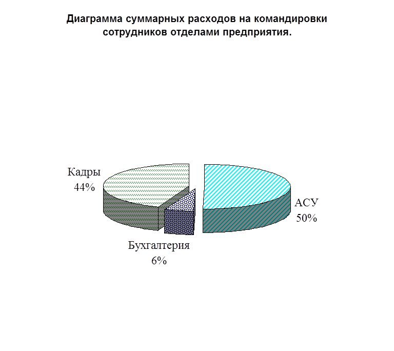 3. Построим круговую диаграмму суммарных расходов на командировки сотрудников отделами предприятия.
