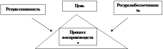 На схеме (рис. 1) показана взаимосвязь ключевых характеристик процесса управления воспроизводством: целенаправленности, результативности, ресурсообеспеченности, эффективности.
