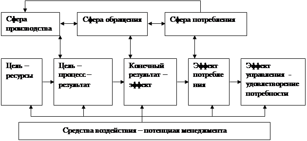 По взаимодействию и соизмерению цели и конечного результата воспроизводственного процесса судят о результативности менеджмента как базовом условии эффективности. Эффективным может быть только результативный менеджмент. О ресурсообеспеченности воспроизводственных процессов судят по реальности ресурсов и целей, сравнивая потенциальные и фактические ресурсы производства. Непосредственный экономический эффект измеряется разностью величин выручки от реализации продукции и издержек производства. Рассмотренные параметры: цели, конечные результаты, ресурсы, издержки, а также величина эффекта — выступают обобщающими средствами менеджмента.