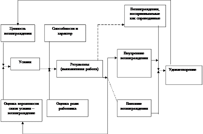 Пунктирная линия между результативностью и внешним вознаграждением означает, что может существовать связь между результативностью какого-либо сотрудника и выдаваемыми ему вознаграждениями. Дело в том, что эти вознаграждения отражают возможности вознаграждения, определяемые руководителем для данного сотрудника и организации в целом. Пунктирная линия между результативностью и вознаграждением, воспринимаемым как справедливое, использована для того, чтобы показать, что в соответствии с теорией справедливости, люди имеют собственную оценку степени справедливости вознаграждения, выдаваемого за те или иные результаты. Удовлетворение — это результат внешних и внутренних вознаграждений с учетом их справедливости. Удовлетворение является мерилом того, насколько ценно вознаграждение на самом деле. Эта оценка будет влиять на восприятие человеком будущих ситуаций.