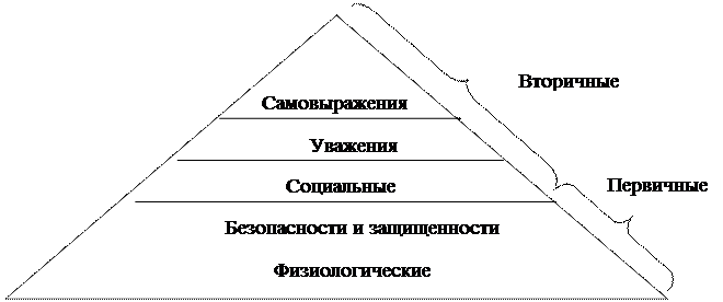 Первые две группы потребностей первичные, а следующие три вторичные. Согласно теории Маслоу, все эти потребности можно расположить в строгой иерархической последовательности в виде пирамиды, в основании которой лежат первичные потребности, а вершиной являются вторичные. Иерархия потребностей по Маслоу проиллюстрирована на рисунке 1.