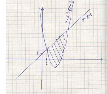 Задача 12. Вычислить площадь фигуры, ограниченной параболой y=x2–6x+7 и прямой y=x+1. Сделать чертеж.