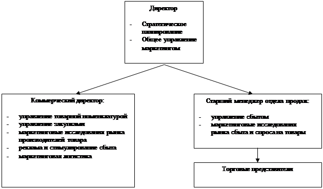 Принцип организации управления маркетингом на ООО «Дарья» - функциональный. Хотя маркетинговый отдел и не создан, руководящие работники предприятия осуществляют различные функции маркетинга и подчиняются директору. Стоит отметить, что каждый сотрудник выполняет несколько маркетинговых функций, как бы сопутствующих его основной деятельности. Для небольшой торговой фирмы эта схема оптимальная: простая в управлении, малозатратная и обеспечивает необходимые результаты.