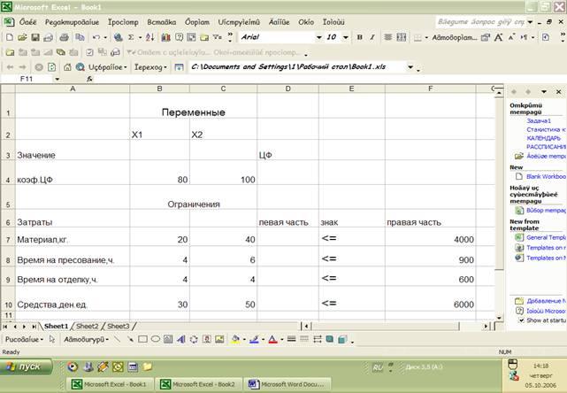 - Создадим форму для ввода условий задачи. Запустим Excel, выбрав Microsoft Excel из Программы главного меню Windows. Открывается чистый лист Excel. Создаём текстовую форму – таблицу для ввода условий задачи (рис. 1.1)