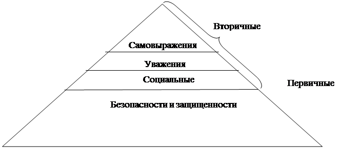 Первые две группы потребностей первичные, а следующие три вторичные. Согласно теории Маслоу, все эти потребности можно расположить в строгой иерархической последовательности в виде пирамиды, в основании которой лежат первичные потребности, а вершиной являются вторичные. Иерархия потребностей по Маслоу проиллюстрирована на рисунке 1.