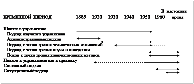На рисунке 1 представлена эволюция управления как науки во временном периоде (от зарождения науки до настоящего времени). Явно просматривается, какие подходы в управлении получили развитие на практике менеджмента и на современном этапе, а какие остались лишь в теории.