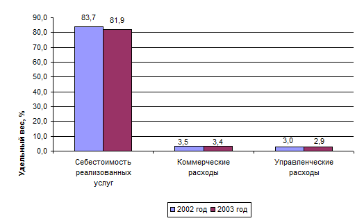 Анализируя структуру расходов от обычного вида деятельности ООО «Крузарус» можно отметить в 2003 году снижение удельного веса себестоимости реализованных услуг (81,9%), коммерческих расходов (3,4%) и управленческих расходов (2,9%) по отношению к полученной выручке за реализованные услуги по грузоперевозкам (рис. 2)
