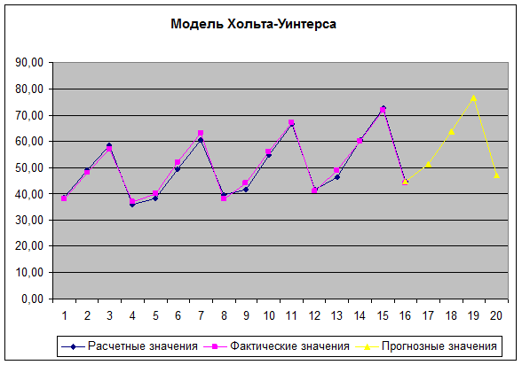 1) Построить адаптивную мультипликативную модель Хольта-Уинтерса с учетом сезонного фактора, приняв параметры сглаживания α1=0,3; α2=0,6; α3=0,3.
