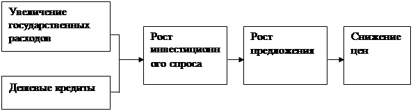 Кейнс считал, что поднять уровень предложения можно, создав эффективный спрос, который для предпринимателей должен стать внешней активизирующей силой. Другим рычагом роста предложения должны стать дополнительные инвестиции, подстегнутые дешевым кредитом. Эффективный спрос правительство создает тем, что оно предоставляет крупным фирмам весомый государственный заказ. Фирмы связанные со смежниками, дают им тоже соответствующие заказы. В результате создается мультипликационный эффект, приводящий в движение большой комплекс предприятий. Спад сокращается безработица снижается. Предложение подстегнутое заказами и дешевым кредитом, растет, что приводит в конечном счете к падению цен, сокращению инфляции.