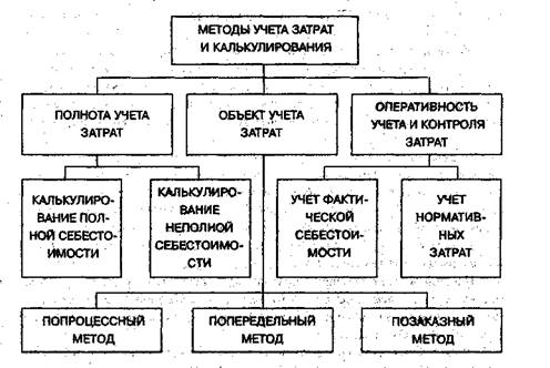 По объектам учета затрат выделяются попроцессный, попередельный и позаказный методы. С точки зрения полноты учитываемых издержек возможно калькулирование полной и неполной («усеченной») себестоимости. В зависимости от оперативности учета и контроля затрат различают метод учета фактических и нормативных затрат.