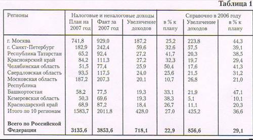 В 2007 году объем поступивших налоговых и неналоговых доходов превышает объем первоначально утвержденных на 718,1 млрд. рублей (на 22,9%). В таблице 1 представлены субъекты Российской Федерации, имеющие в 2007 году существенное повышение фактически поступивших налоговых и неналоговых доходов над плановыми назначениями.