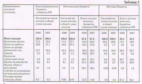 Наибольшую долю в доходах консолидированных бюджетов субъектов РФ составляют налог на прибыль (30,8% в 2006 году и 27,1% в 2007 году) и налог на доходы физических лиц (24,7% в 2006 году и 26,2% в 2007 году).