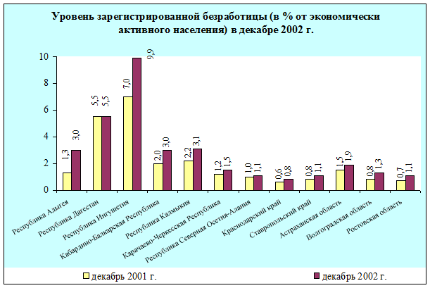 В Южном федеральном округе, по-прежнему, проблема занятости населения остается первоочередной. Рост уровня безработицы отмечен практически во всех субъектах округа. Наиболее существенно уровень безработицы повысился в республиках Адыгея (3,0% в 2002 г. против 1,3% в 2001г.), Ингушетия (9,9% и 7,0%), Кабардино-Балкария (3,0% и 2,0%), Волгоградской (1,3% и 0,8%), Ростовской (1,1% и 0,7%) областях. В Кабардино-Балкарской Республике сохранилась тенденция высвобождения излишнего персонала на убыточных предприятиях с нестабильной загрузкой.