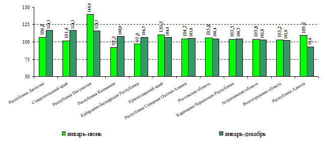 В 2002 году несмотря на чрезвычайные погодные условия, имевшие место в январе и июне, социально-экономическая ситуация в Южном федеральном округе не претерпела резких изменений по сравнению с 2001 годом. Итоги социально-экономического развития свидетельствуют о продолжении позитивного развития экономики в отдельных отраслях материального производства, инвестиционной, денежно-кредитной, внешнеторговой, бюджетной сферах, которые повлияли на некоторое улучшение в социальной сфере. Вместе с тем, по сравнению с 2001 годом темпы физического объема промышленного производства, инвестиций в основной капитал, платных услуг населению замедлились, что объясняется в основном высоким базовым уровнем предыдущего года, а также опережающим ростом цен в указанных сферах деятельности в истекшем году.