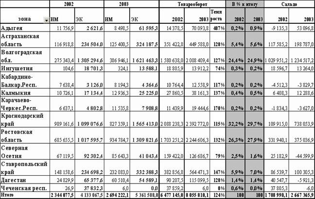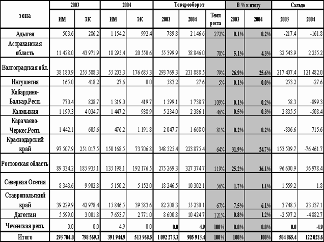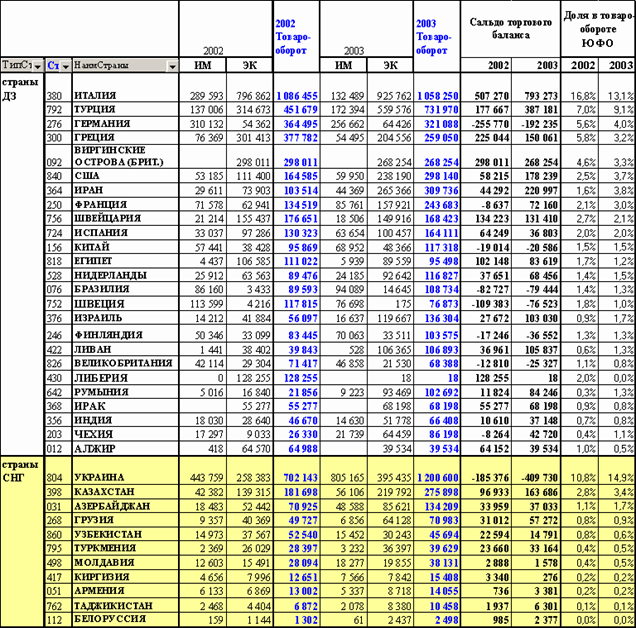 Выгодное географическое положение, наличие высокого производственного, технологического, ресурсного и финансового потенциала, хорошо развитая транспортно-коммуникационной инфраструктура выводят южный регион в разряд наиболее перспективных для привлечения иностранных инвестиций и динамичного развития внешнеэкономических связей. Все больше предприятий выходит на внешний рынок, создаются благоприятные условия для транзита внешнеторговых грузов, развиваются транс-европейские транспортные коридоры, возрождаются Волжский путь «Север – Юг» и Великий Шелковый путь. В 2002 году товарооборот по субъектам ЮФО достиг 6,4 млрд. долларов США (экспорт - 4,1 млрд. долларов, импорт – 2,3 млрд. долларов). Содействие развитию внешней торговли определяется сейчас как один из приоритетов таможенной политики.