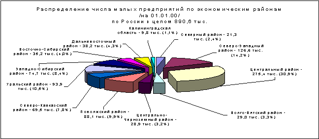 До настоящего времени сохраняется неравномерность распределения малых предприятий по территории России. Так, порядка 30% всех действующих МП расположены в Центральном районе (см. диаграмму 3). Среди городов сохраняют лидерство по числу МП Москва и Санкт-Петербург. В них сосредоточено соответственно 20% и 12% всех российских малых предприятий. [13]